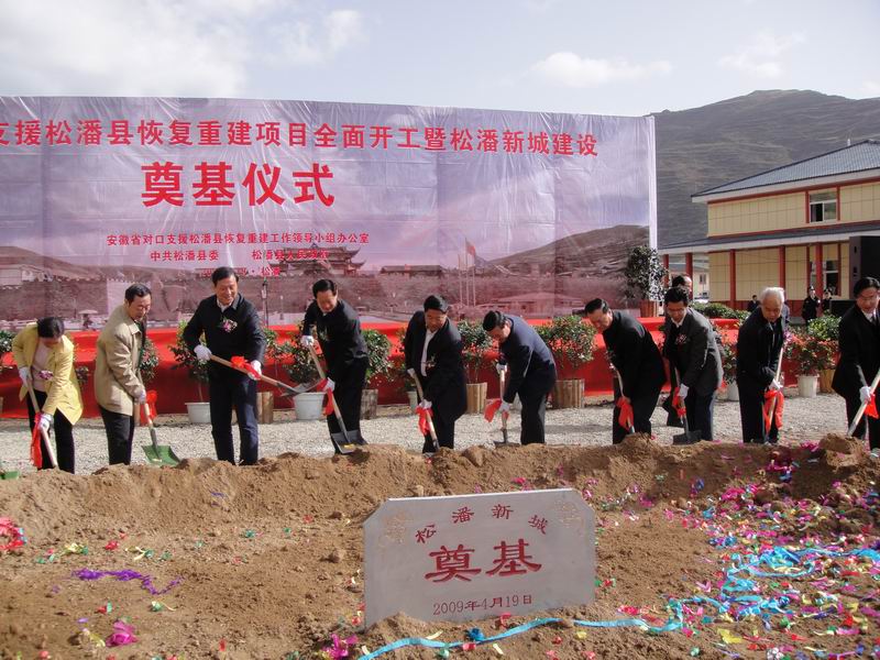 安徽省駐松援建辦主任孔曉宏首先介紹了開工項目情況,松潘縣委書記、縣人大常委會主任黃芝林致辭發(fā)言,施工單位、監(jiān)理單位代表分別作了發(fā)言。阿壩州州長吳澤剛、安徽省省長助理、省對口援建辦主任梁衛(wèi)國也先后作了重要講話。最后,安徽省人大副主任朱先發(fā)宣布安徽省對口援建松潘縣恢復重建項目全面開工,安徽省、四川省、阿壩州、松潘縣領導在隆隆的禮炮聲中為松潘新城建設開挖了第一鍬土。