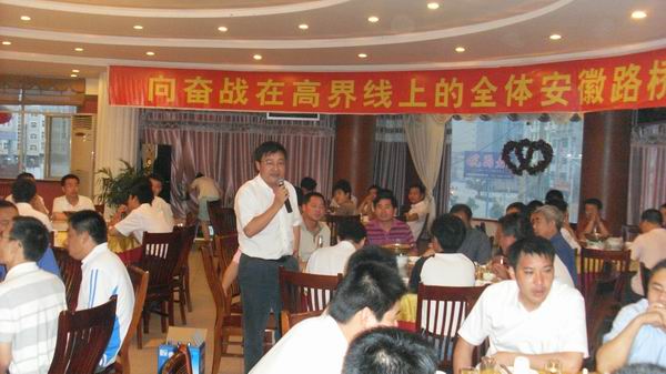 晚上,項(xiàng)目部安排慶功晚宴,公司總經(jīng)理汪衛(wèi)東攜路面公司領(lǐng)導(dǎo)班子成員,特地來(lái)到工地與大家歡聚一堂。