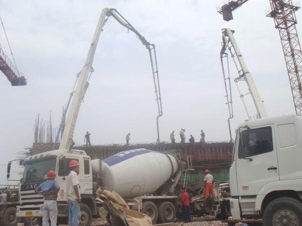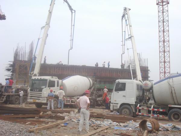 盛夏季節(jié),驕陽似火。經(jīng)項目部科學(xué)組織、精心準(zhǔn)備、合理安排,2009年6月21日上午六安市淠望路大橋工地上人頭攢動、機器轟鳴,兩臺混凝土泵車高高聳立在大橋主墩0#塊上面。九時許,經(jīng)現(xiàn)場監(jiān)理組和業(yè)主驗收后,淠望路大橋主墩0#塊開始澆注混凝土,現(xiàn)場施工人員克服高溫酷暑天氣,經(jīng)過個5個多小時的連續(xù)奮戰(zhàn),于當(dāng)天下午三點順利完成混凝土的澆筑工作。