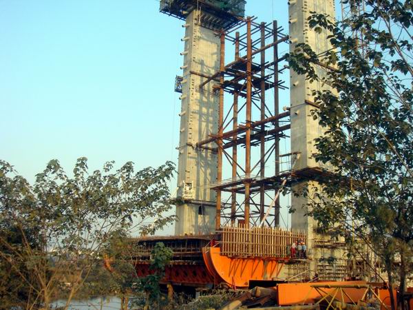 六安淠望路大橋主跨長120,共有15個節(jié)段,最大節(jié)段長10米,寬35米,重410噸。普通節(jié)段長7米、寬27米、重300噸。由于節(jié)段長、重量大,普通掛籃不能滿足施工要求,按設(shè)計要求采用前支點(diǎn)掛籃,掛籃的前端支點(diǎn)利用斜拉索掛制于索塔。施工過程中前點(diǎn)荷載均由斜拉索承受,澆注混凝土?xí)r,通過調(diào)整索力來調(diào)整掛籃高程。本項(xiàng)目采用的前支點(diǎn)掛籃,掛籃長18米、寬30米、重166噸,此種掛籃施工工藝在公司尚屬首次。