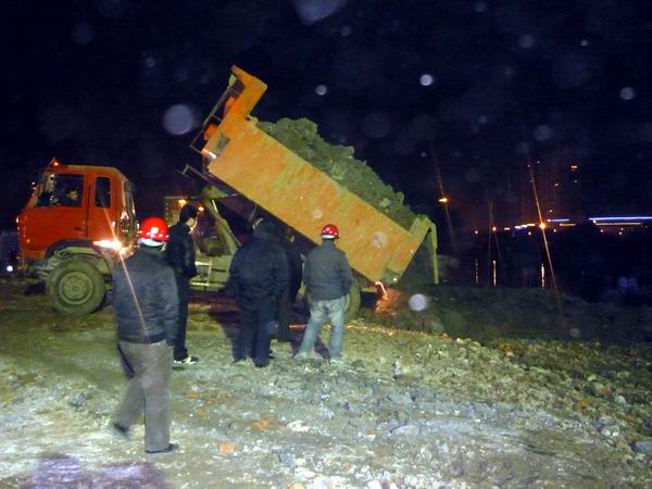 當(dāng)1219日,宋斗灣路完成第一根樁(位于南淝河北側(cè),屬于3#橋臺(tái))的開(kāi)挖澆注工作后,項(xiàng)目經(jīng)理部就開(kāi)始籌劃南淝河南側(cè)的筑島圍堰工作。1224日,當(dāng)3#橋臺(tái)的六根樁全部澆注完成后,當(dāng)天晚上仍繼續(xù)前一晚的筑島工作。每次筑島時(shí),現(xiàn)場(chǎng)橋梁技術(shù)員、測(cè)量技術(shù)員和安全員都和工人們一起奮戰(zhàn),而每次奮戰(zhàn)都是一個(gè)通宵。截至25日,南淝河筑島圍堰共計(jì)用土近270車(chē),約4600方,筑島面積和筑島深度達(dá)到預(yù)案和監(jiān)理要求,符合現(xiàn)場(chǎng)施工的實(shí)際要求。至此,筑島圍堰工作圓滿完成。