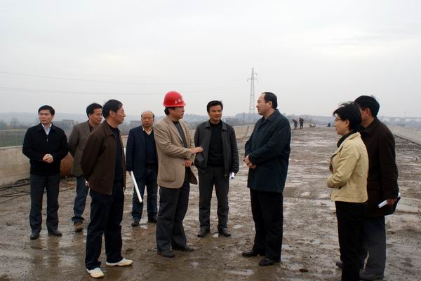 319上午920,蕪湖市政府副市長朱誠在市交通局、公路局、蕪湖縣政府等相關(guān)領(lǐng)導(dǎo)陪同下,來我青弋江大橋視察指導(dǎo)工作。朱市長一行下車后步行上橋,看到我大橋護(hù)欄、砼橋面已全部完成后,非常高興。在聽了基本情況匯報后,他指出:這座橋是這條路的龍頭,希望能早日通車,并對項目部提出要求,415一定要完成瀝青路面及附屬工程,確保簡易通車。